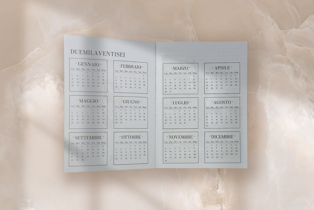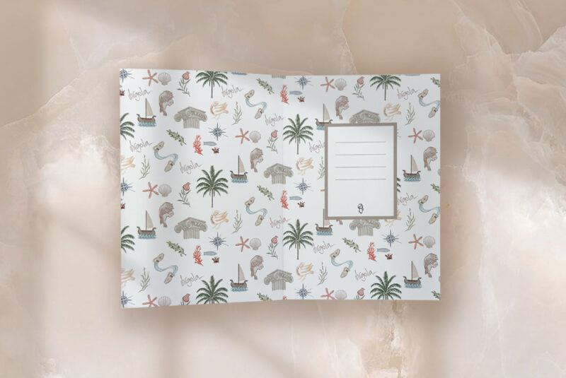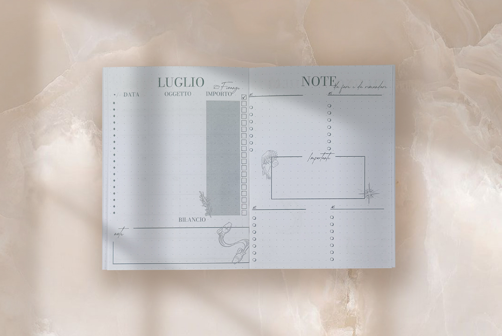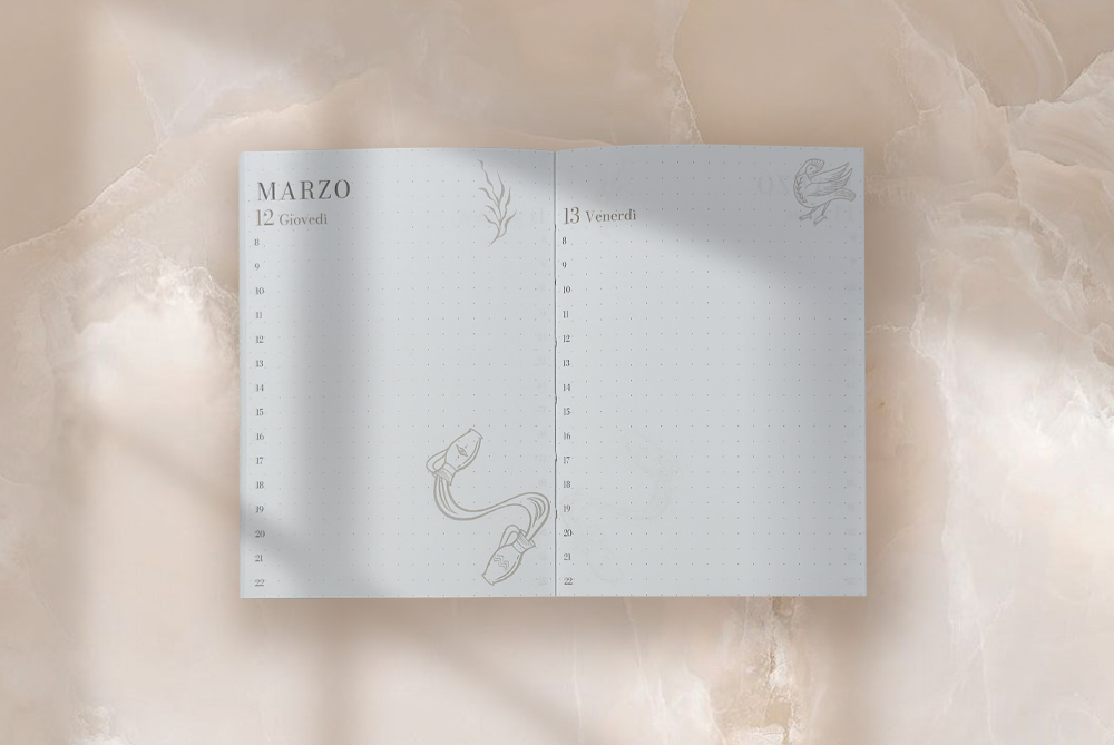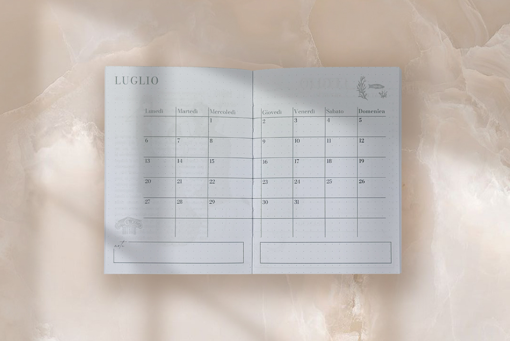 • Ionio: copertina turchese, elastico aqua, grafica silver, Segnalibro turchese.