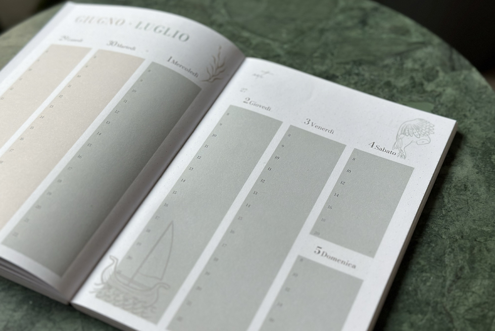 • Anemos: copertina magenta, elastico arancione, grafica oro. Segnalibro arancione.